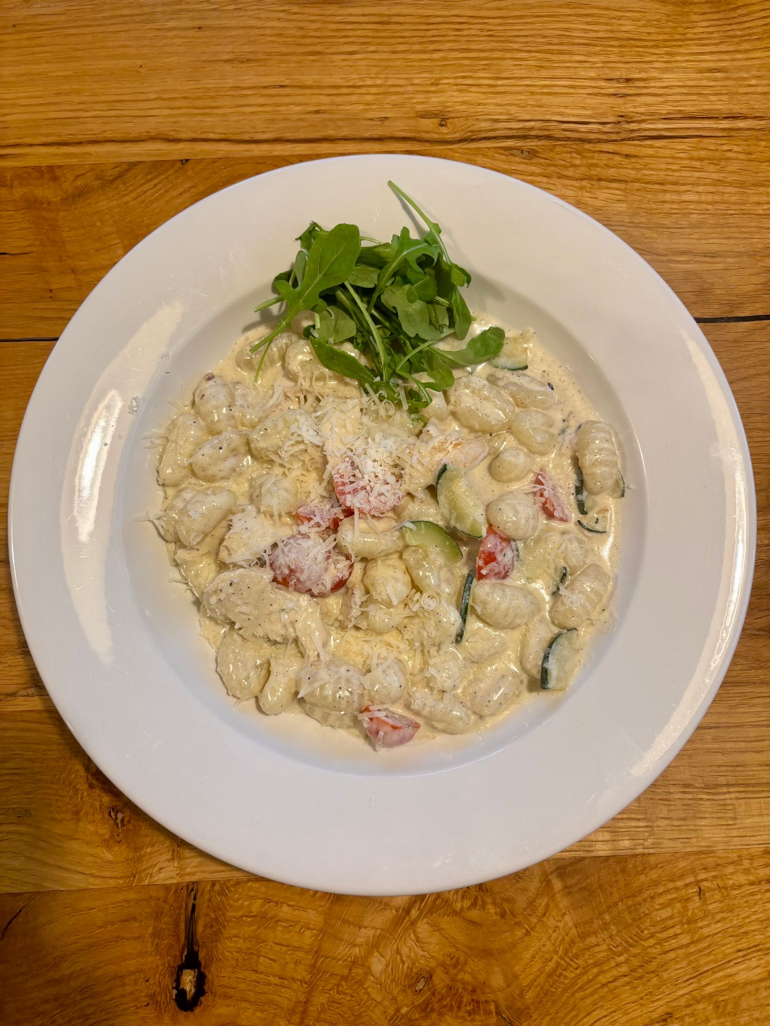 10. Gnocchi zuchine: cukinia, grillowany kurczak, pomidorki koktajlowe, sos śmietanowy