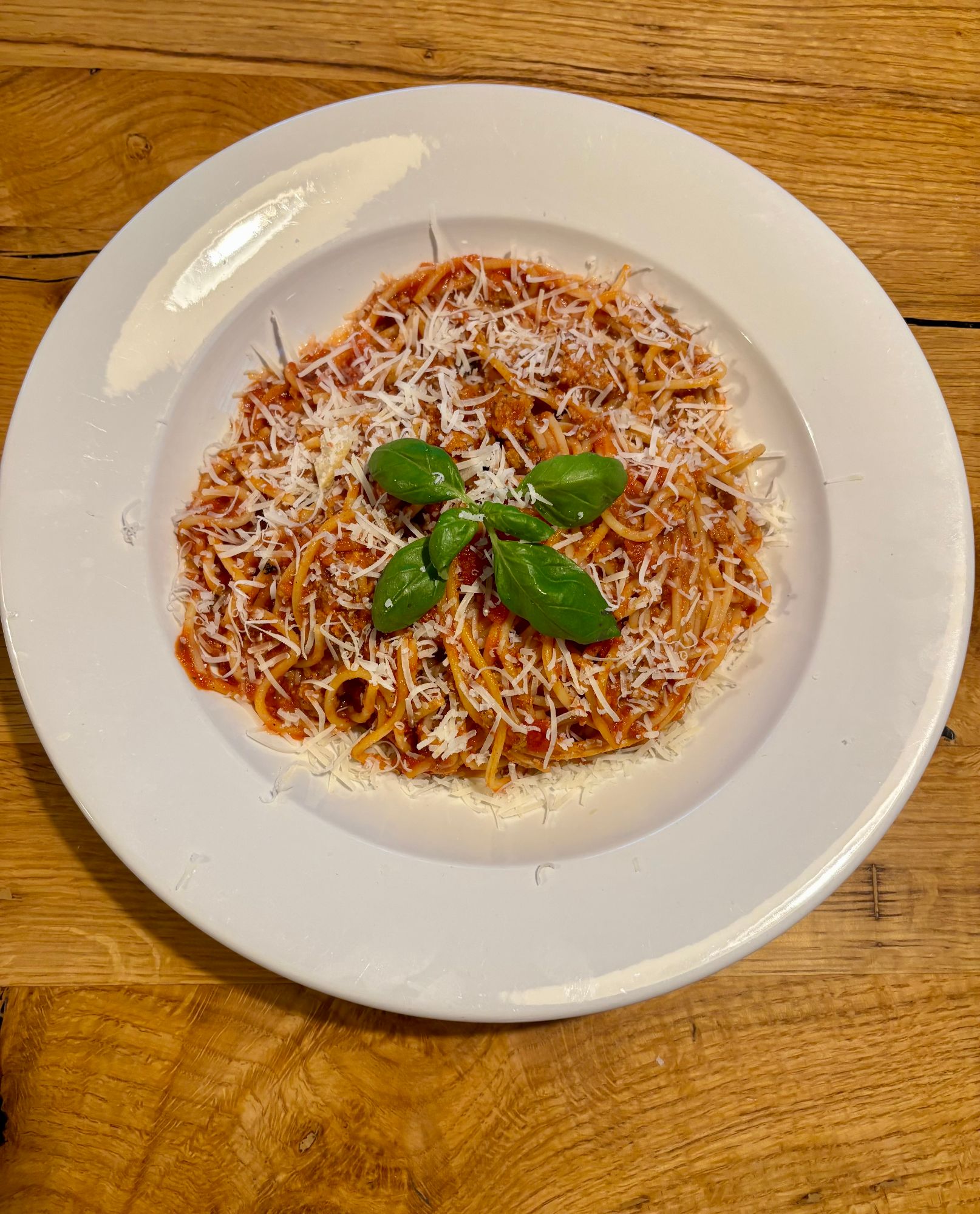 2. Bologes: mięso mielone, cebula, czosnek, sos pomidorowy, parmezan