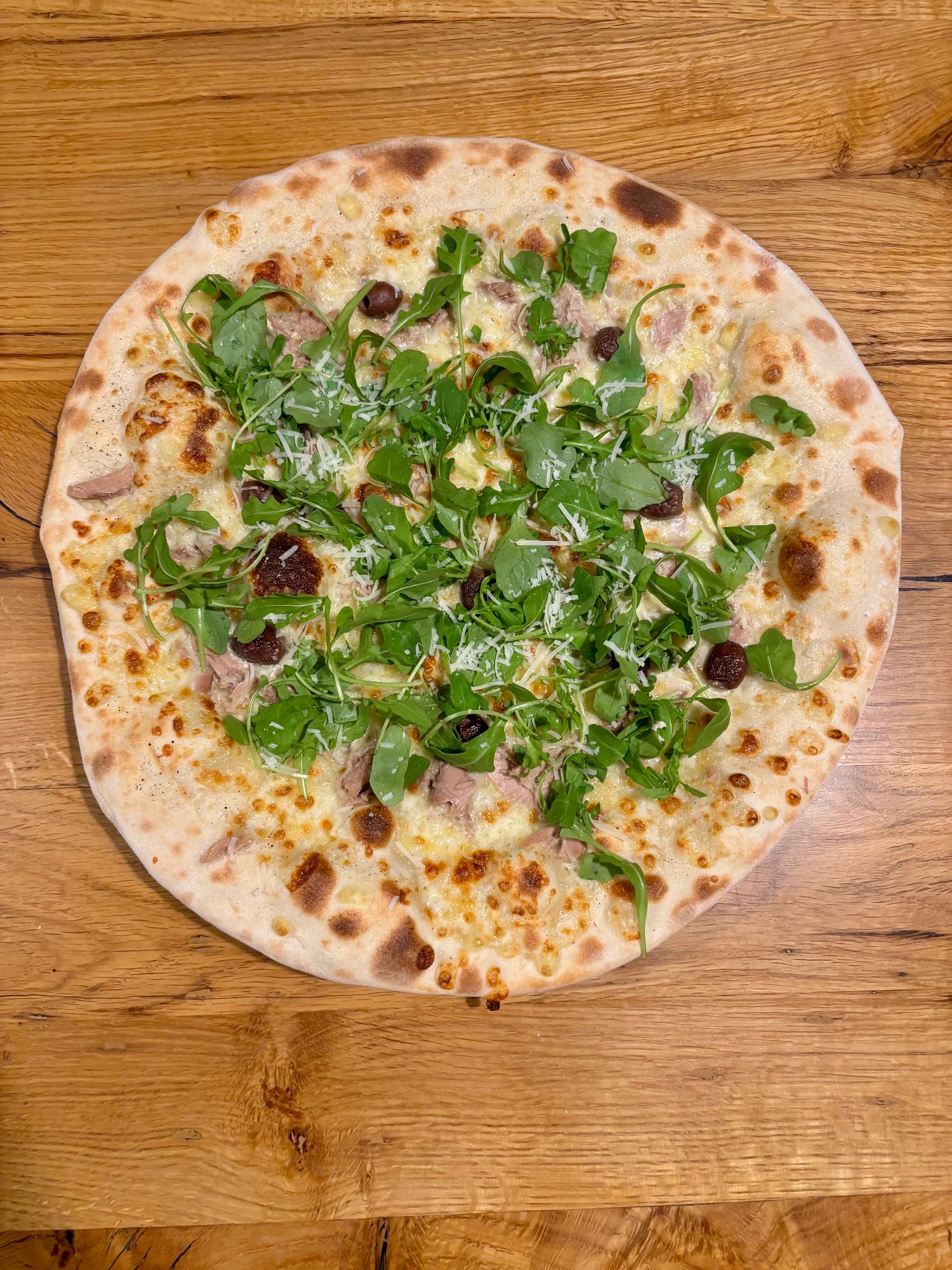 14. Siciliana: tuńczyk, oliwki, rukola, parmezan,biały sos